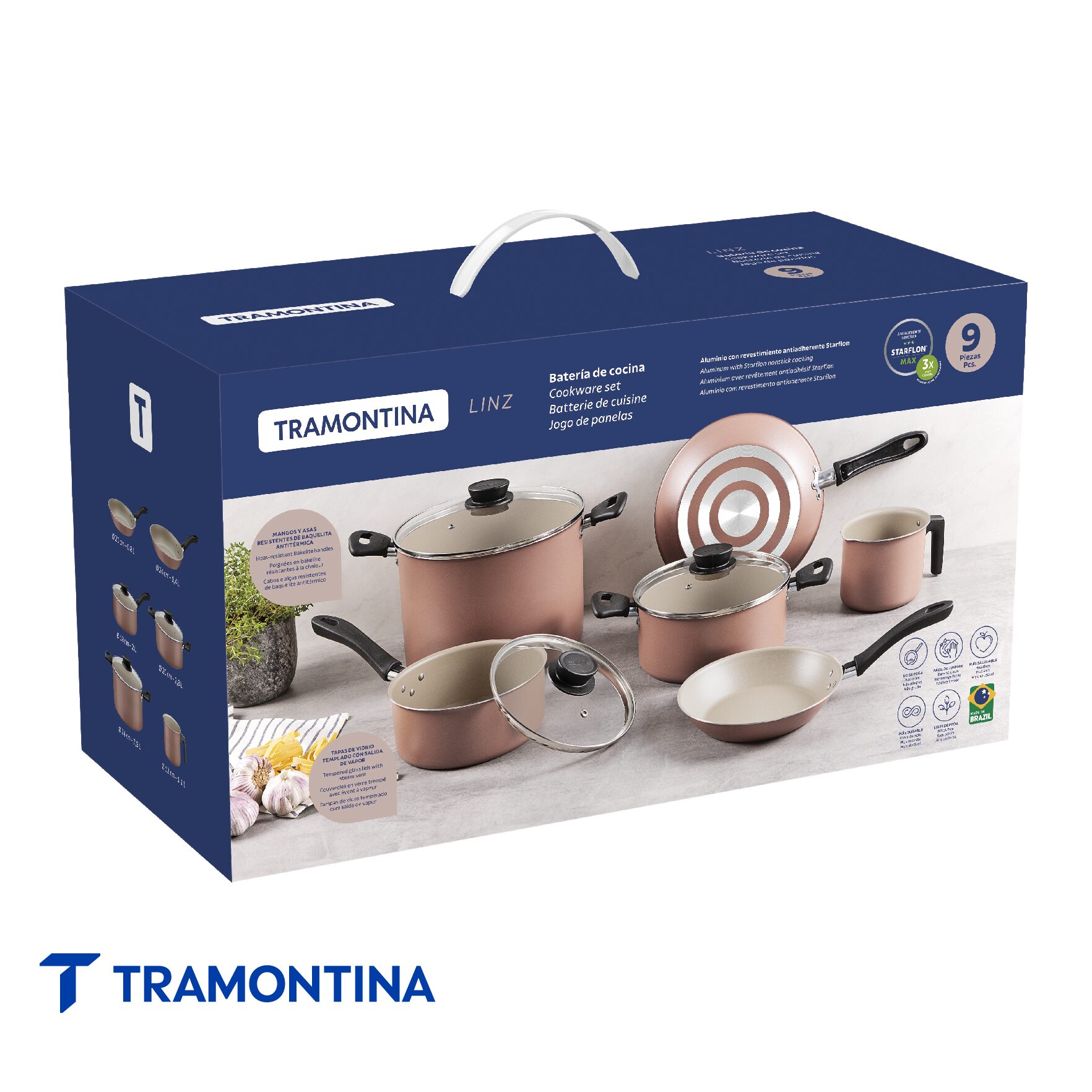 La batería de cocina Tramontina Linz en aluminio con revestimiento interno y externo en antiadherente Starflon Max marrón de 9 piezas es una excelente elección para la rutina de la cocina. El aluminio combinado con el antiadherente garantiza una cocción uniforme, evita que los alimentos se peguen y facilita la limpieza. Los mangos, asas y agarradores son antitérmicos y aseguran un manejo seguro, mientras que las tapas de vidrio templado con bordes de acero inoxidable hacen más práctica la preparación. Un juego versátil, funcional y fácil de mantener.