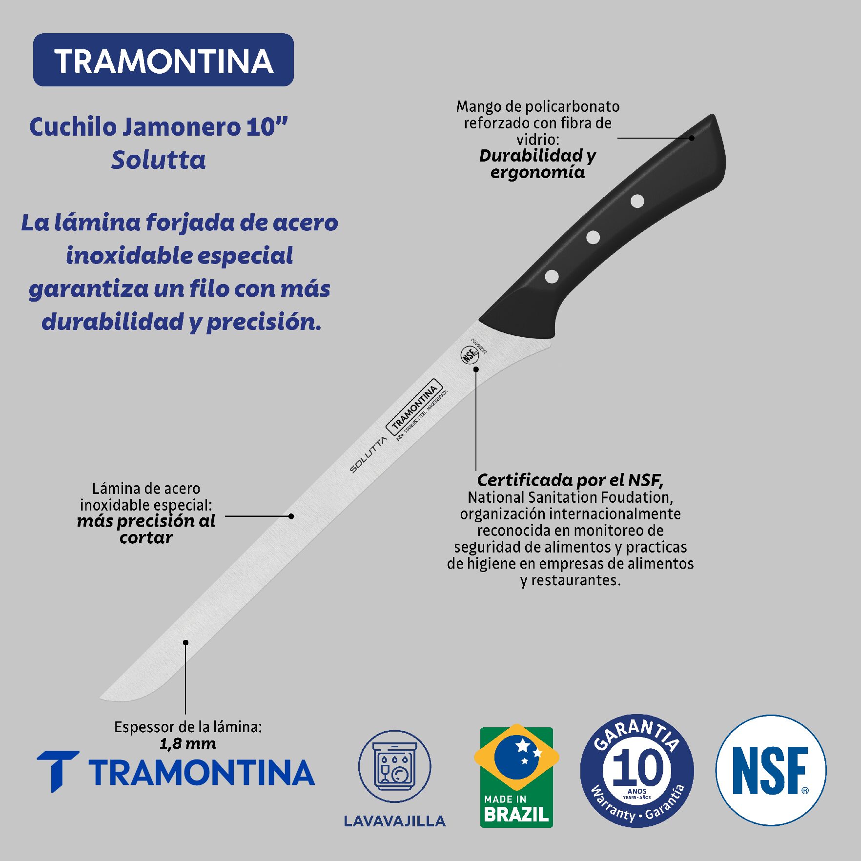 Con el cuchillo Jamonero Tramontina Solutta con lámina en acero inoxidable y mango en policarbonato y fibra de vidrio de 10 pulgadas negro, la preparación de los alimentos se vuelve más práctica y funcional. La lámina de acero inoxidable ofrece un filo resistente y duradero. El mango de policarbonato con fibra de vidrio brinda confort y firmeza durante el uso. Certificado por la NSF, el cuchillo es compatible con el lavavajillas y garantiza más practicidad y facilidad para el uso diario en la cocina.