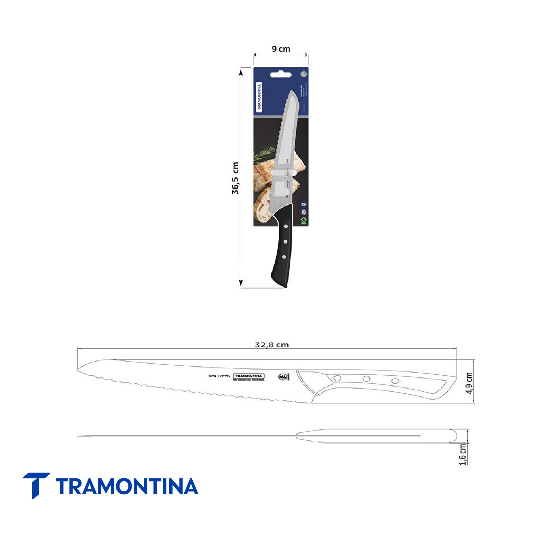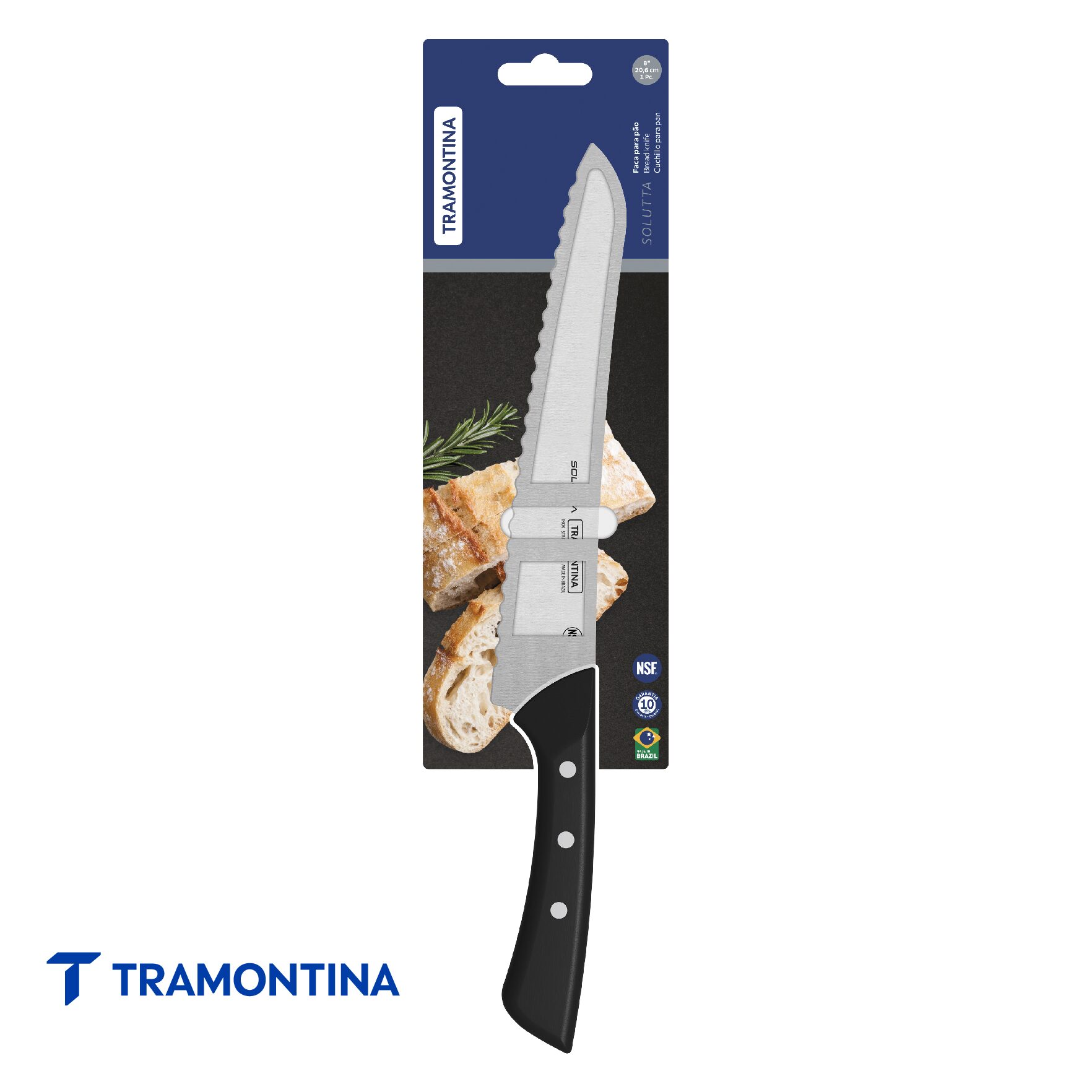 Con el cuchillo para pan Tramontina Solutta con lámina en acero inoxidable y mango en policarbonato y fibra de vidrio de 8 pulgadas negro, la preparación de las comidas se vuelve mucho más práctica. Producido con una lámina de acero inoxidable, ofrece un filo durable y resistente. El mango robusto de policarbonato reforzado con fibra de vidrio brinda seguridad y confort para el uso. Certificado por la NSF y compatible con el lavavajillas, es una opción práctica y confiable para el día a día.