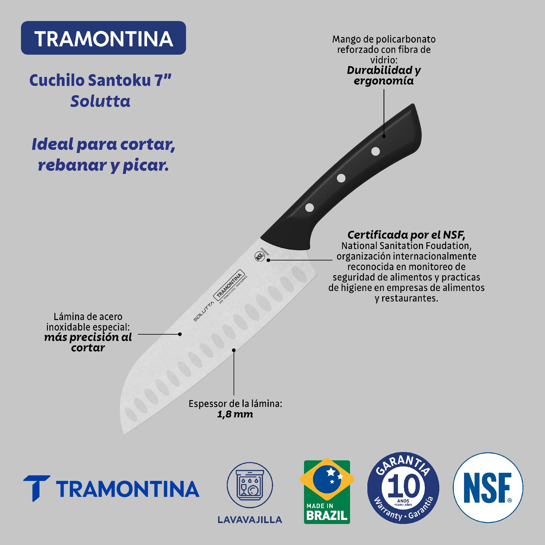El cuchillo Santoku Tramontina Solutta con lámina en acero inoxidable y mango en policarbonato y fibra de vidrio de 7 pulgadas negro facilita la preparación de una variedad de alimentos. Fabricado con una lámina de acero inoxidable, el cuchillo garantiza un filo duradero y resistente. El mango de policarbonato con fibra de vidrio brinda más durabilidad. Certificado por la NSF y resistente al lavavajillas, combina seguridad y practicidad para convertirse en la elección ideal para su día a día.
