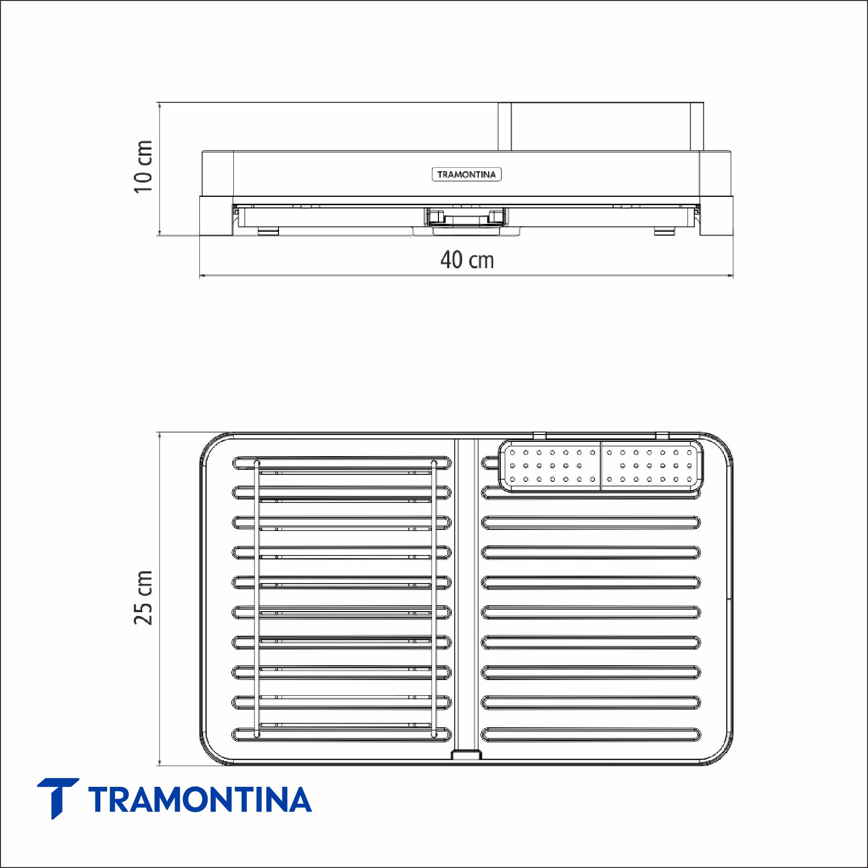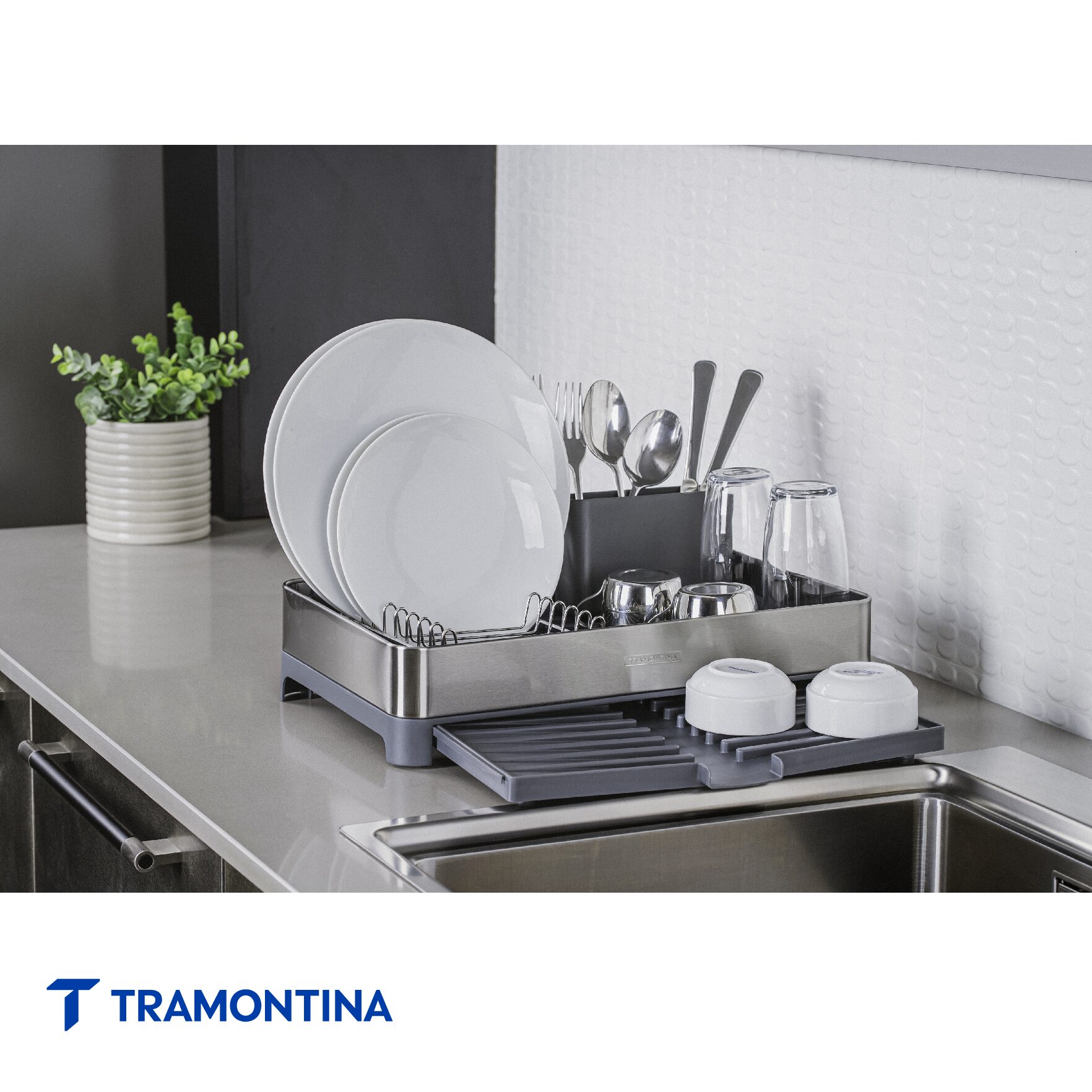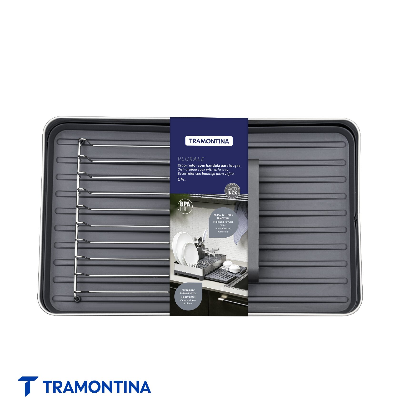 Para aquellos días de rutina corrida en los que no tienes tiempo para las tareas de la casa, cuenta con el escurridor de vajilla Tramontina Plurale en acero inoxidable y polipropileno con porta cubiertos grafito. Cuenta con un práctico portacubiertos de polipropileno con perfecto encaje en su superficie. Compacto pero sin dejar de acomodar la vajilla que precisas, comporta 9 platos, cubiertos y vasos, siendo que el portavasos es expansible. Tiene asas que permiten más seguridad en el manejo e inclinación que dirige el agua hacia la bandeja colectora, haciendo que caiga directamente en la bacha. Un artículo práctico e indispensable para quienes siempre están en la correría.