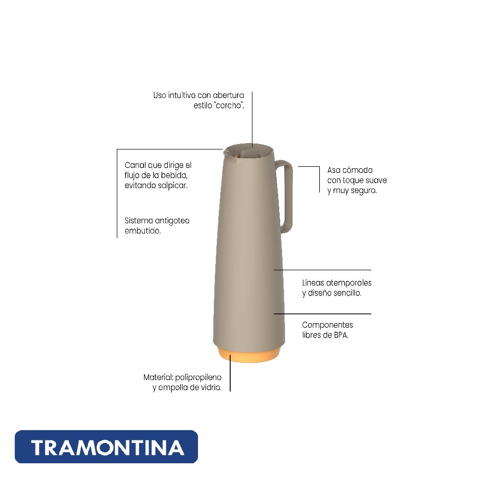 Para garantizar la practicidad de su rutina diaria y conservar sus bebidas a la temperatura ideal, la jarra térmica Tramontina Exata en plástico beige con ampolla de vidrio 1 litro es indispensable. Ideal para llevar al trabajo, la escuela o mantenerla en su cocina, puede utilizarse con líquidos calientes y fríos, porque posee una ampolla de vidrio especial. Su utilización es bellísima, y gracias a su apertura de estilo corcho, tiene la dirección ideal para las bebidas. ¡Además, la jarra térmica está producida en plástico, tiene un color especial que deja su rutina diaria mucho más especial y sello IF Design, que certifica toda la calidad que merece!