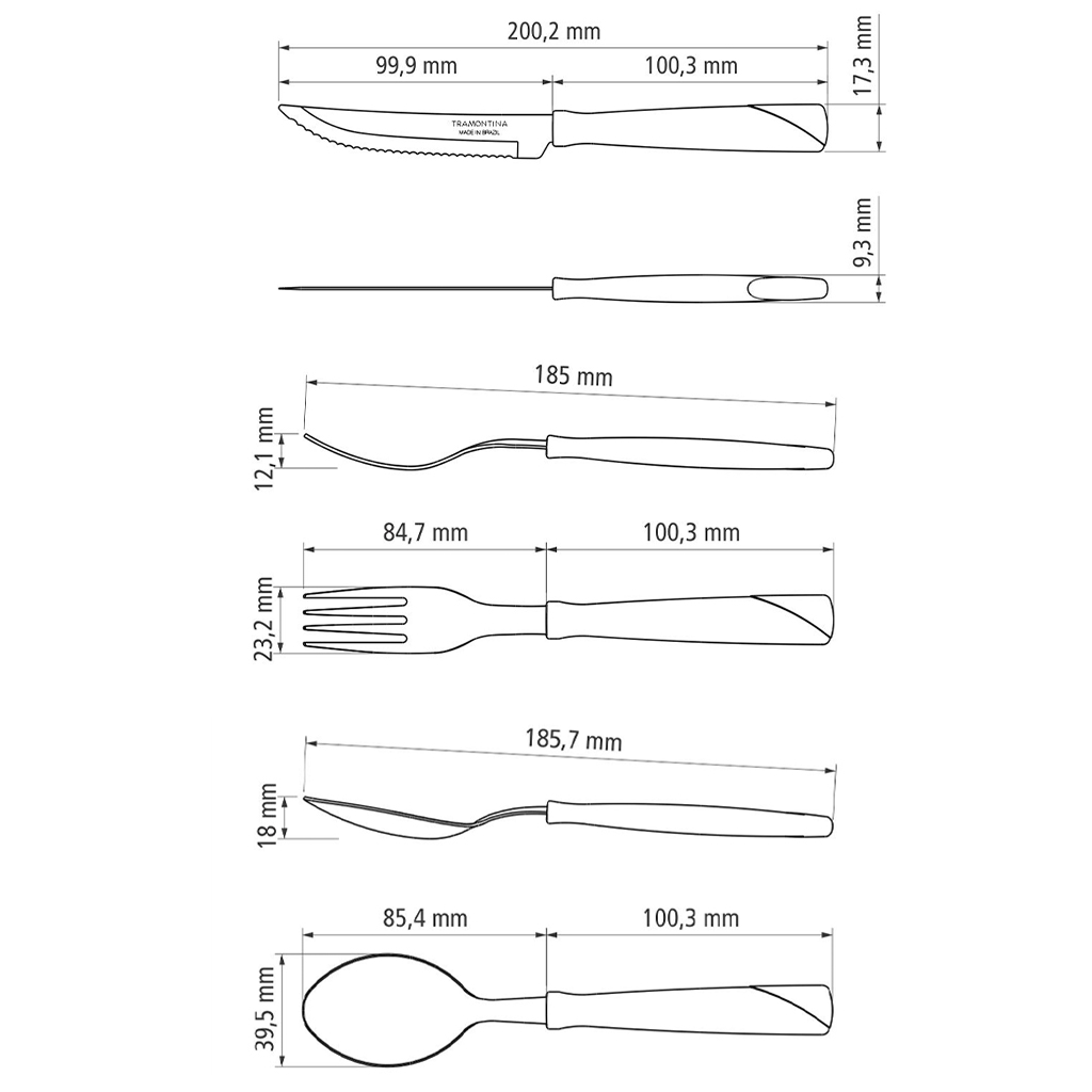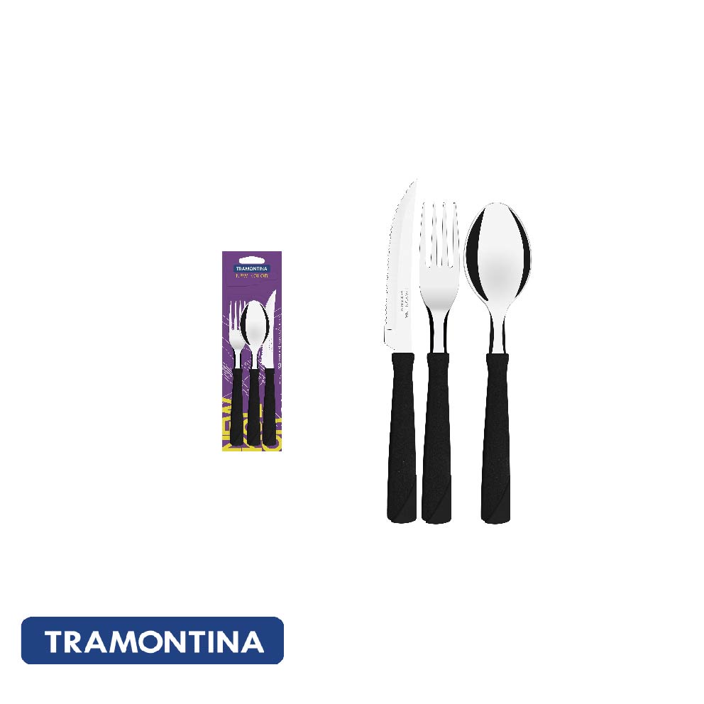 Toda cocina precisa cubiertos de calidad, entonces, opta por el Juego de Cubiertos Tramontina New Kolor con Láminas de Acero Inoxidable y Mangos de Polipropileno Negro 3 Piezas y deja tus comidas todavía más completas. El juego con 3 piezas tiene tenedor, cuchara y cuchillo con láminas de acero inoxidable y mangos de polipropileno que proporcionan más comodidad en el manejo, ya que su formato es anatómico, que se acomoda perfectamente en la mano. El cuchillo tiene tratamiento térmico, proceso que le otorga al material más resistencia y durabilidad, además de ofrecerle vida larga al filo de corte. Y para que tengas todavía más practicidad en tu día a día, las piezas se pueden llevar al lavavajillas. Es la calidad Tramontina facilitando tu día.