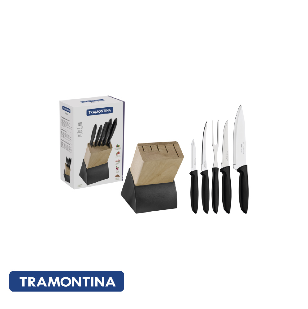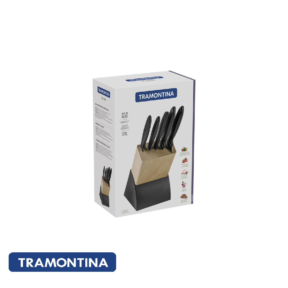 Juego de Cuchillos Tramontina Plenus con Hojas de Acero Inoxidable Mangos de Polipropileno Negro y Soporte de Madera 6 Piezas