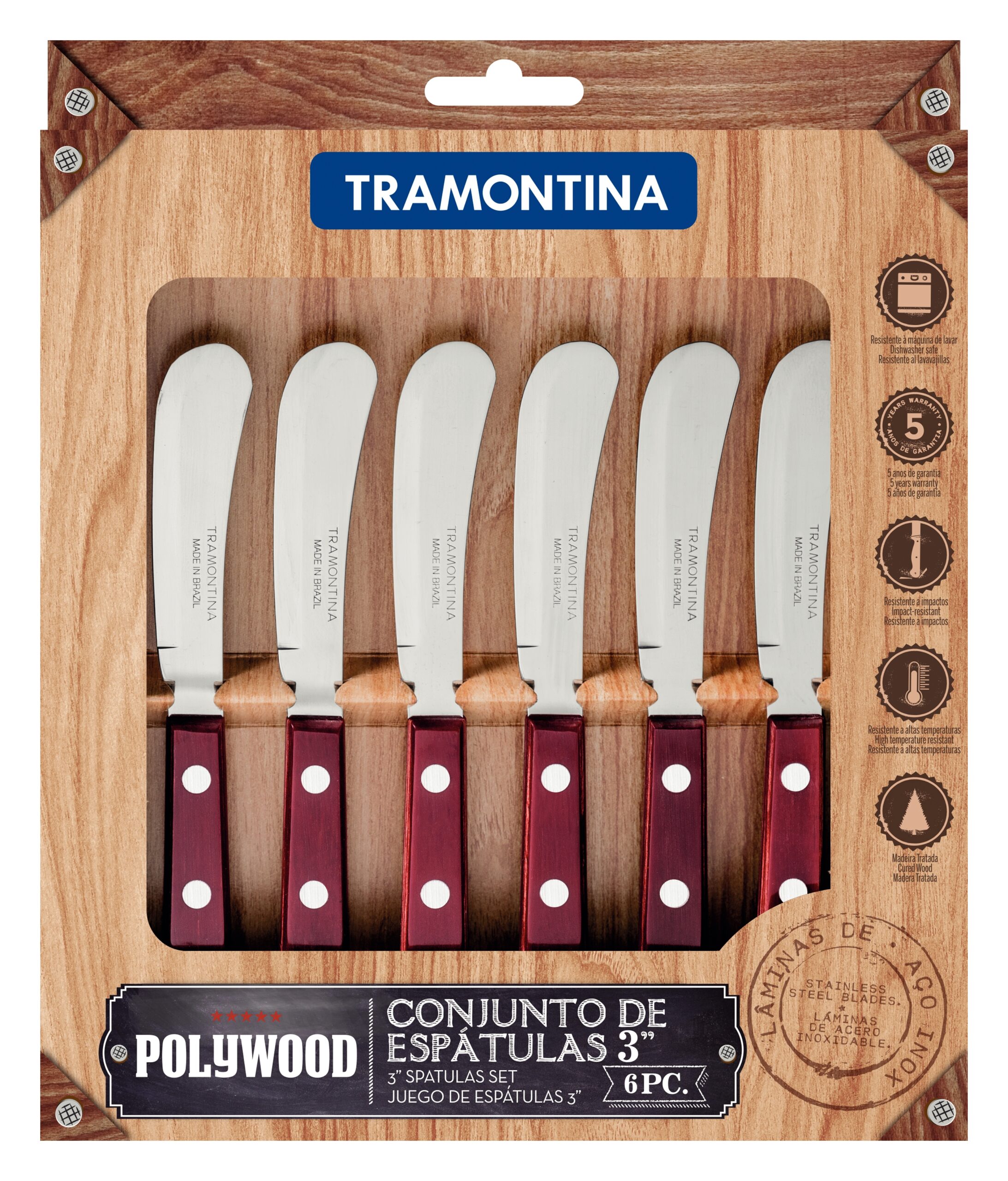 Con el juego de espátulas para mantequilla Tramontina Polywood con láminas de acero inoxidable y mangos de madera rojo de 6 piezas el desayuno será aún más delicioso, además de ser el juego ideal para lucirse en la mesa. Las espátulas de la línea Polywood están fabricadas con láminas de acero inoxidable de alta calidad, lo cual garantiza su durabilidad y belleza por más tiempo. Los mangos están fabricados en madera tratada Polywood, por lo que son resistentes al paso del tiempo, la humedad e impactos. ¡Con el juego de espátulas, su desayuno o merienda serán mucho más especiales!