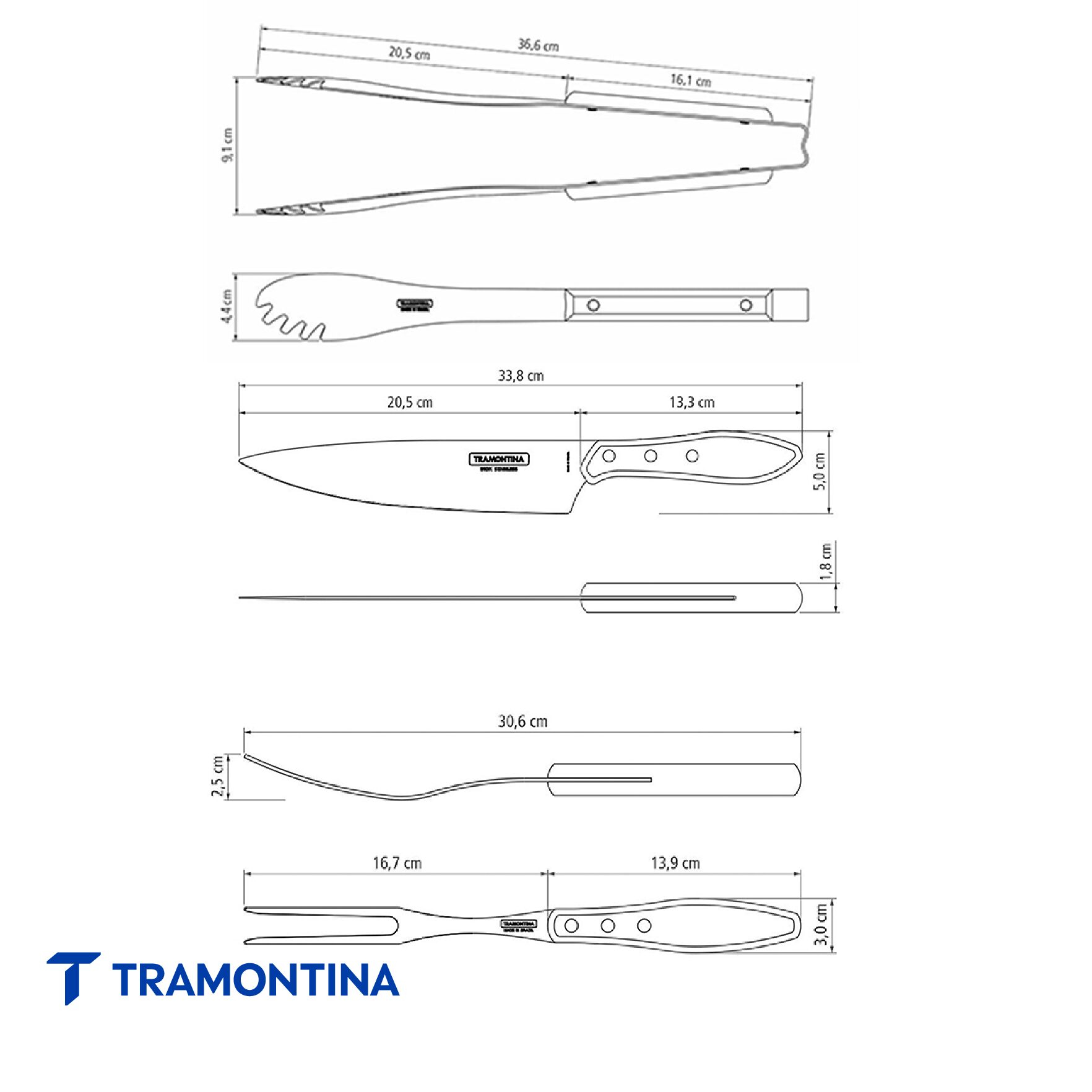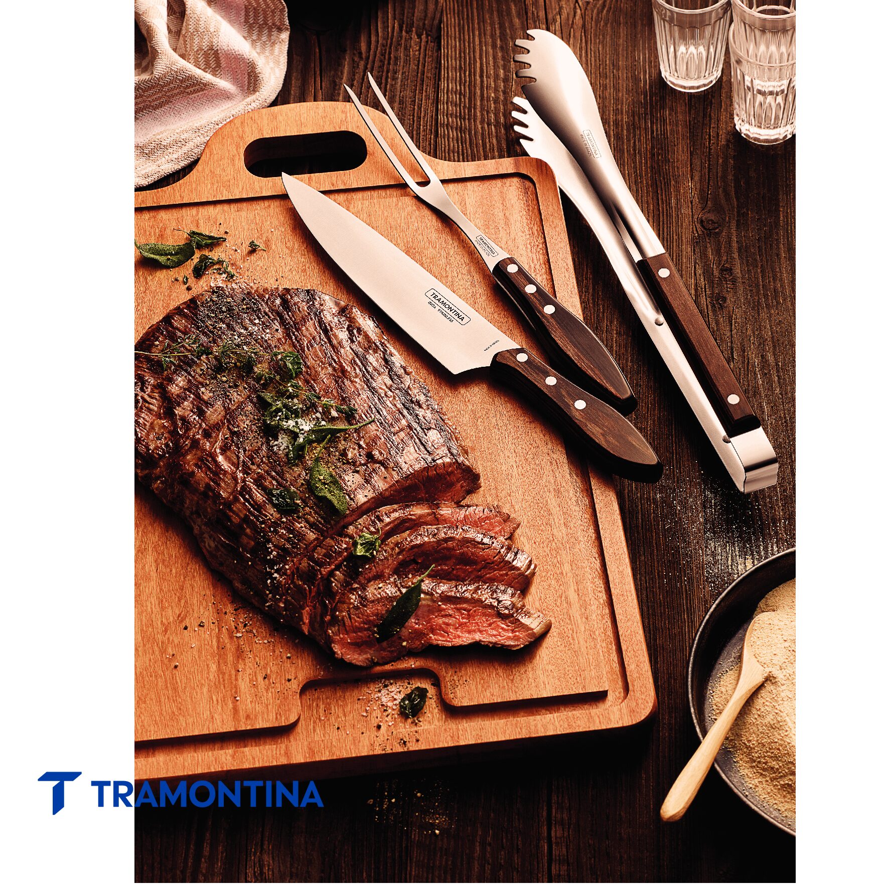 La línea Churrasco Tramontina ofrece una solución completa para preparar y servir un delicioso asado. Con el juego para asado Tramontina con láminas de acero inoxidable y mangos de madera tratada polywood castaño, 3 piezas, usted contará con la posibilidad de tener un excelente corte de carne, además de hacer que el momento de servir a todos sea más práctico. Las piezas se fabrican con láminas de acero inoxidable durable. Los mangos de madera tratada Polywood, son resistentes a impactos y altas temperaturas. Una elección que se lucirá en todas las ocasiones.