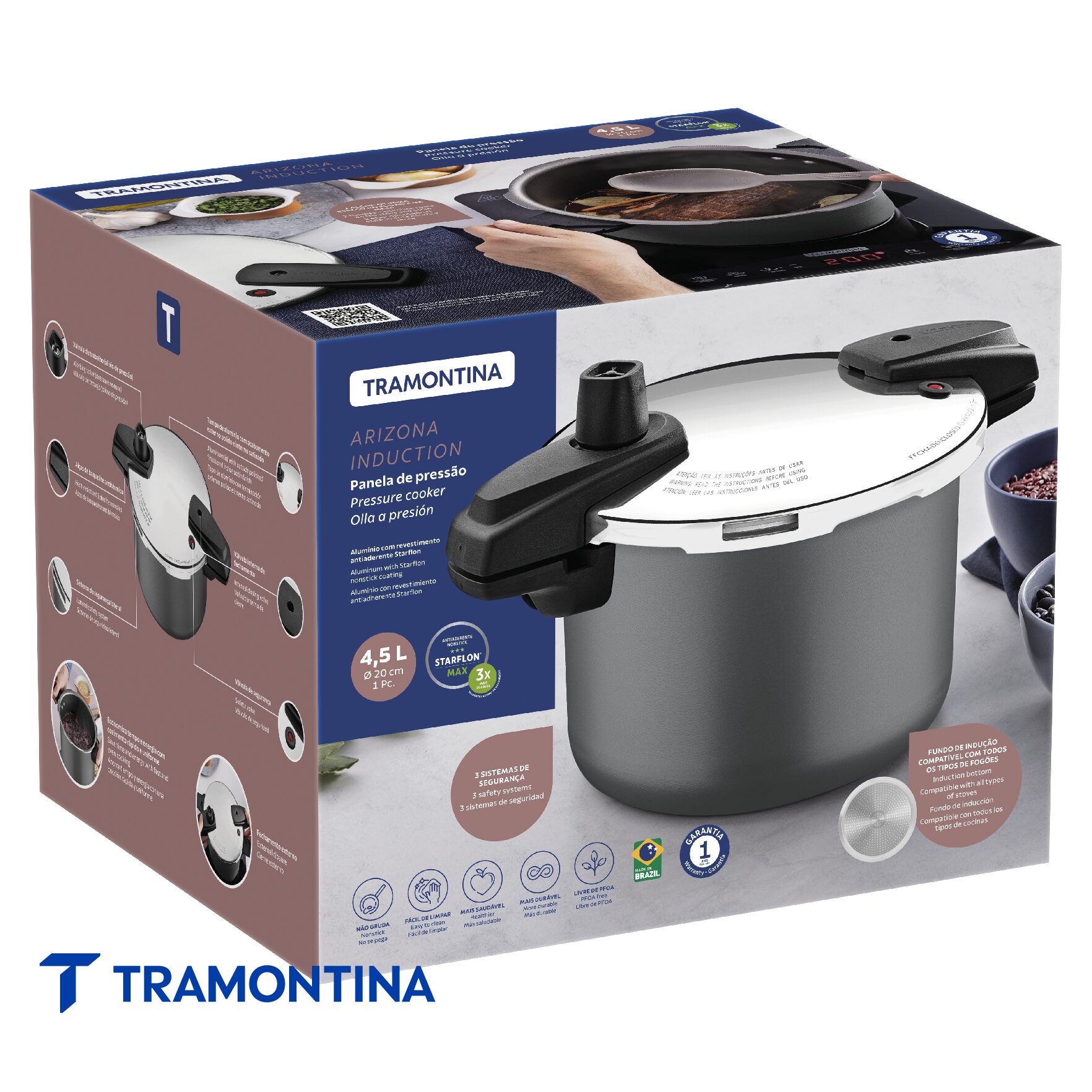 La olla a presión Tramontina Arizona Induction en aluminio con revestimiento interno y externo en antiadherente Starflon Max titanio de 20 centímetros de diámetro y 4,5 litros combina practicidad y eficiencia para la rutina diaria. Con 20 cm de diámetro, 4,5 litros de capacidad y fondo de inducción, es compatible con todo tipo de cocinas. Su cuerpo de aluminio proporciona una cocción uniforme, mientras que las asas de baquelita antitérmica y la tapa en aluminio pulido garantizan comodidad y seguridad para el uso. Una opción ideal para hacer que sus recetas sean más fáciles y sabrosas.