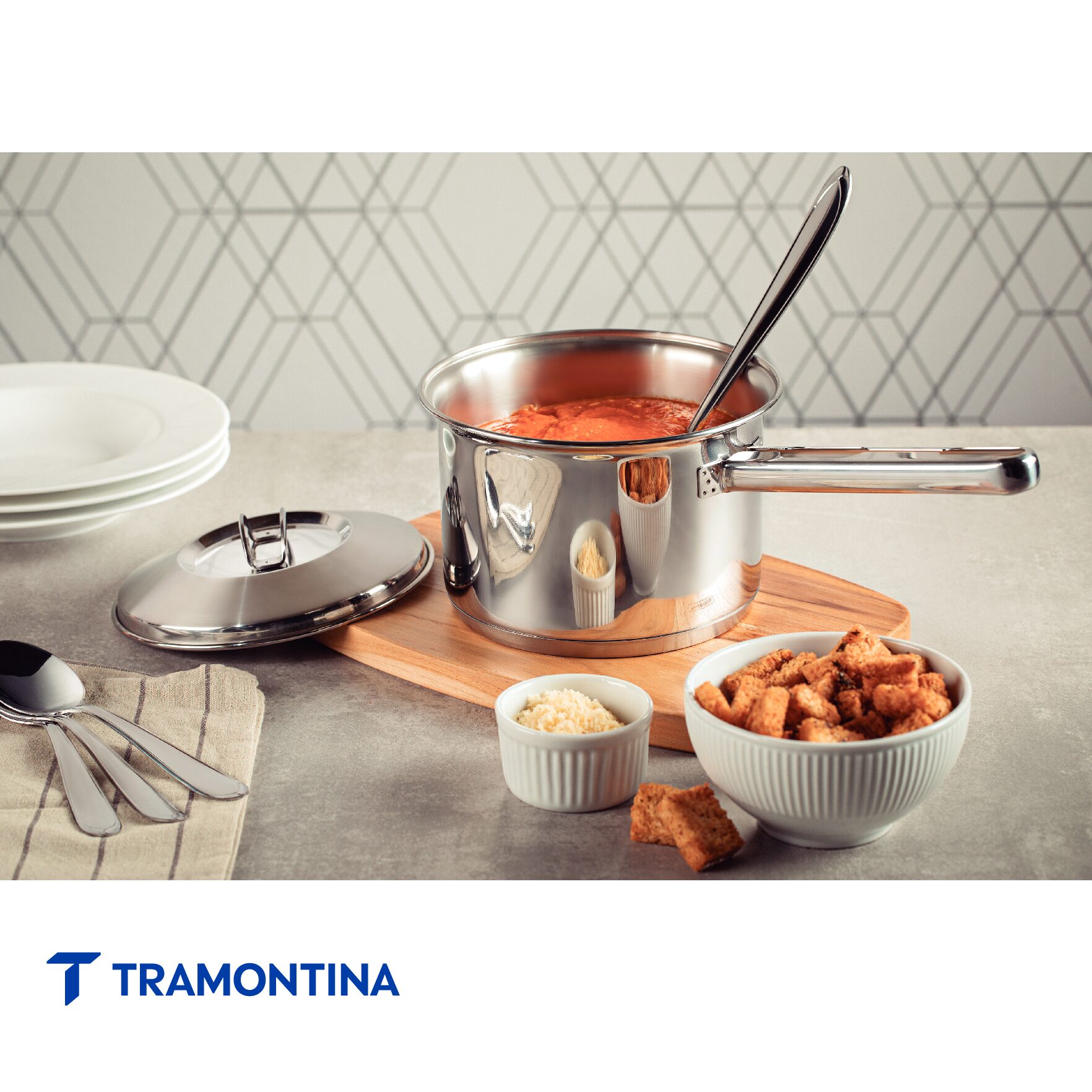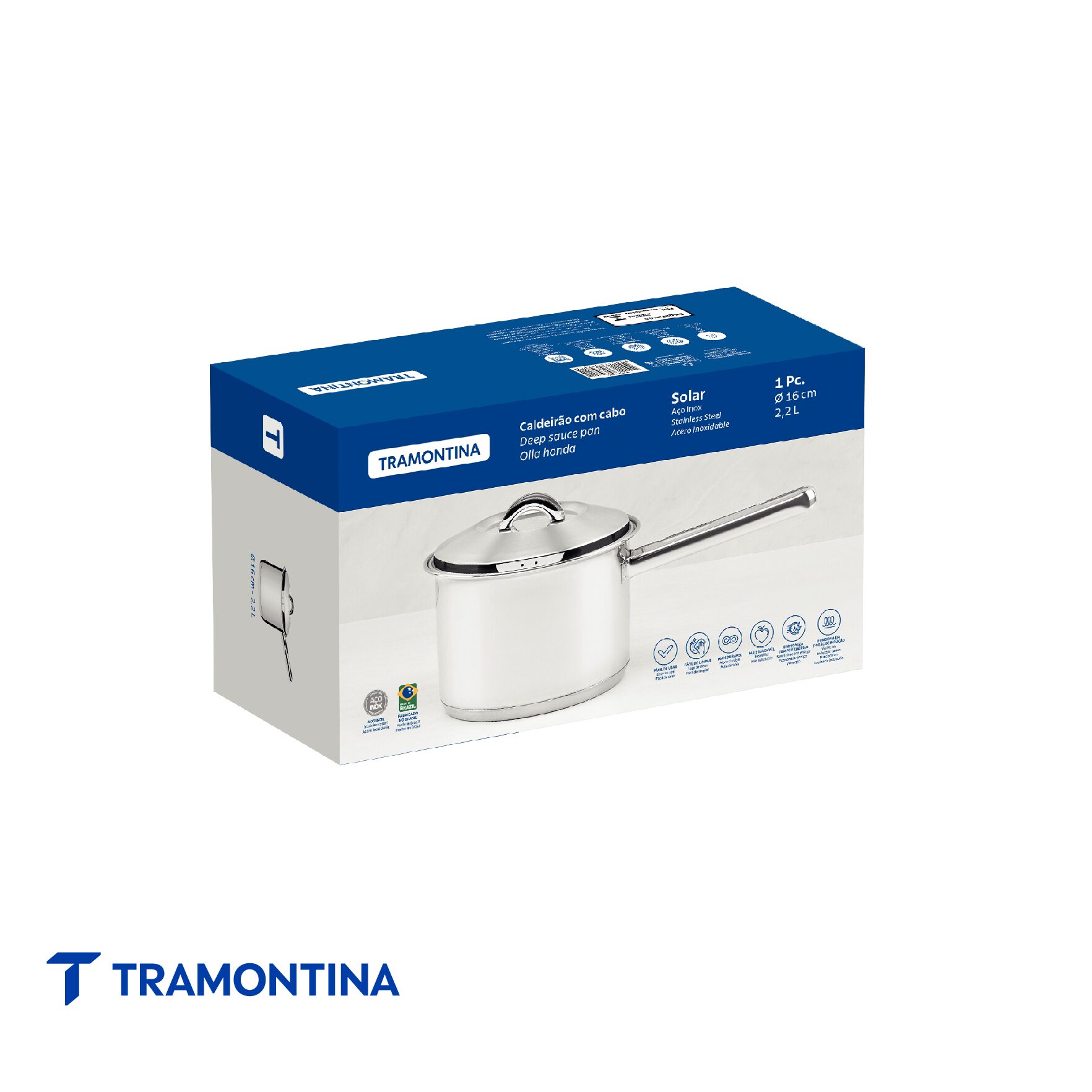 La olla alta Tramontina de acero inoxidable fondo triple con tapa y mango 16 cm de diámetro 2,2 L proporciona durabilidad y practicidad, sea para un cocinero experimentado o que recién está comenzando a descubrir su amor por la gastronomía. Fabricada totalmente de acero inoxidable, no suelta ningún tipo de residuo en los alimentos, garantizando que se mantengan sanos, además de mantener el sabor de los ingredientes y de sus condimentos favoritos. El gran atractivo de la olla alta de Tramontina de la línea Solar es su fondo triple (acero inoxidable + aluminio + acero inoxidable), fue desarrollado con alta tecnología, garantiza que la cocción sea de forma uniforme, proporcionando que los alimentos se cocinen más rápidamente. La elección perfecta para quien busca poner en práctica los más diversos tipos de recetas.
