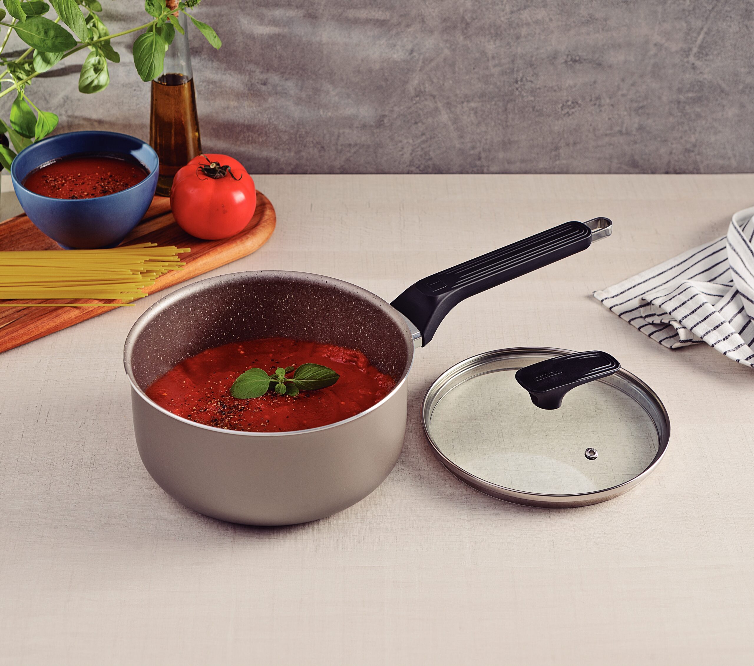La olla Tramontina Milazzo en aluminio con revestimiento interno y externo en antiadherente Starflon Max almendra de 18 centímetros de diámetro es perfecta para preparar comidas rápidas y sanas. Fabricada en aluminio con un revestimiento antiadherente de Starflon Max, permite una cocción uniforme y fácil limpieza, evitando que los alimentos se peguen. El mango de baquelita antitérmica con acabado soft-touch ofrece seguridad y comodidad durante el uso. Acompaña una tapa de vidrio templado con salida de vapor y borde de acero inoxidable, que permiten visualizar la preparación de los alimentos sin perder calor. También se puede usar en cocinas a gas, eléctricas y vitrocerámicas, lo que proporciona una gran versatilidad en la cocina. ¡Incorpore más eficiencia y calidad en sus recetas con Tramontina!