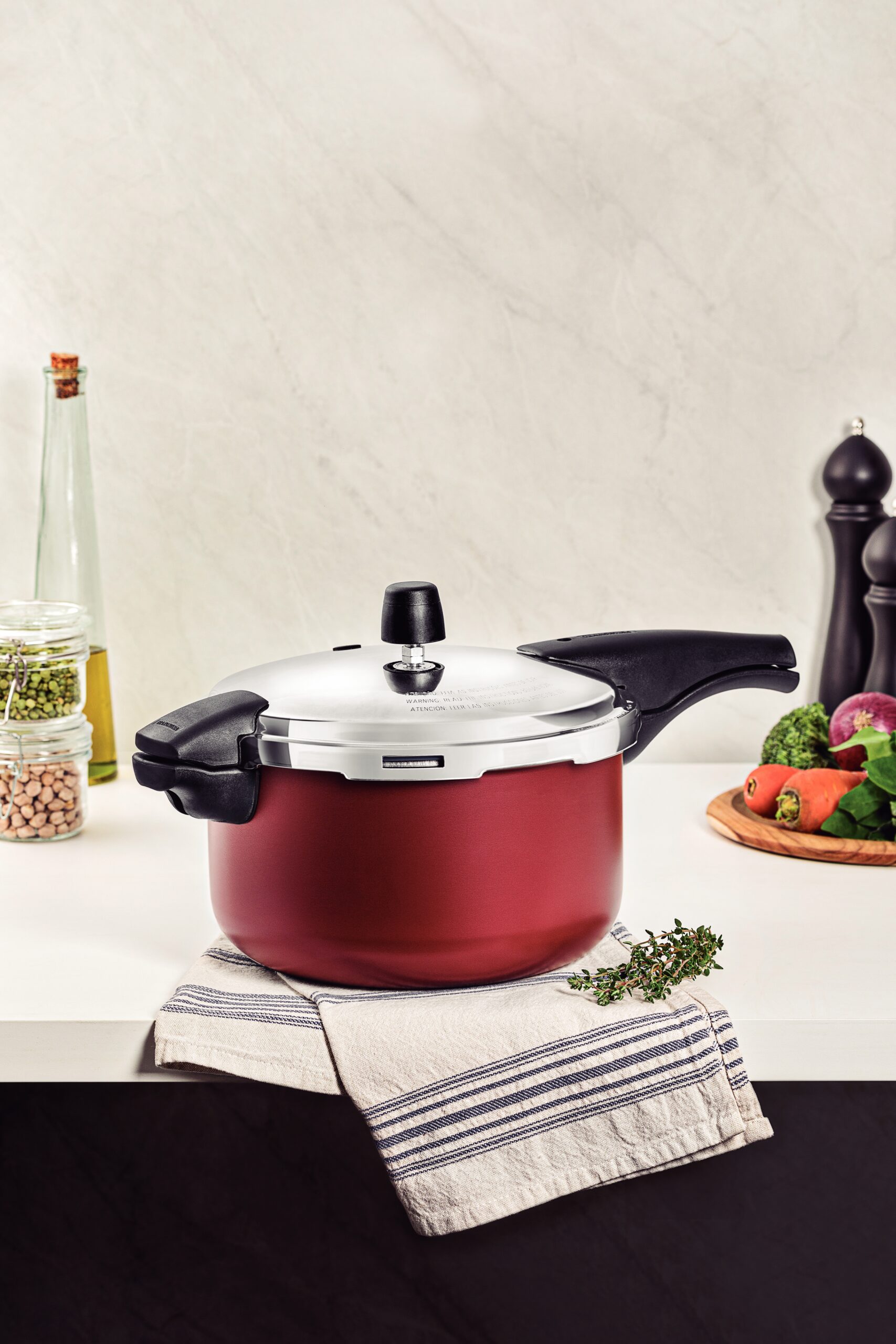 ¡Tanto para una receta especial como para una de rutina, la olla de presión Tramontina Vancouver en aluminio con revestimiento interno y externo antiadherente Starflon Max rojo de 24 centímetros de diámetro y 6 litros es la pieza ideal para acompañarlo! Producida en cuerpo de aluminio de color rojo, permitirá la cocción de los alimentos de manera uniforme y además evitará que se peguen, debido al revestimiento antiadherente Starflon Max aplicado en su interior y exterior. Para su protección, la olla incluye tres válvulas de seguridad para que pueda cocinar de forma tranquila y sin preocupaciones. Sus mangos y asa son de baquelita antitérmica, reducen la propagación del calor y garantizan aún más seguridad y confort durante el uso. ¡Con Tramontina, tiene todo para dejar su cocina más completa y su rutina mucho más práctica!
