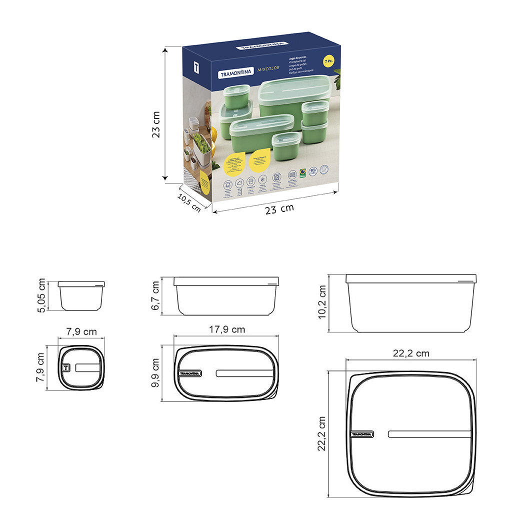 ¿Potes sin tapas en el armario de su cocina? ¡Nunca más! Para eso, puede contar con el juego de potes Tramontina MixColor en polipropileno verde salvia con tapa transparente de 7 piezas. Obtendrá artículos perfectos para almacenar sus alimentos de forma práctica y funcional. Los potes están fabricados en polipropileno con protección antimicrobiana, inhiben y reducen el crecimiento de hongos y bacterias y garantizan toda la calidad que merece para sus alimentos. Los potes tienen diversos tamaños y cada uno posee una tapa transparente. Versatilidad es la palabra clave, porque todas las piezas pueden ir al freezer, al lavavajillas y al microondas. ¡Asegure el suyo y cuente con potes a su disposición siempre que lo necesite!