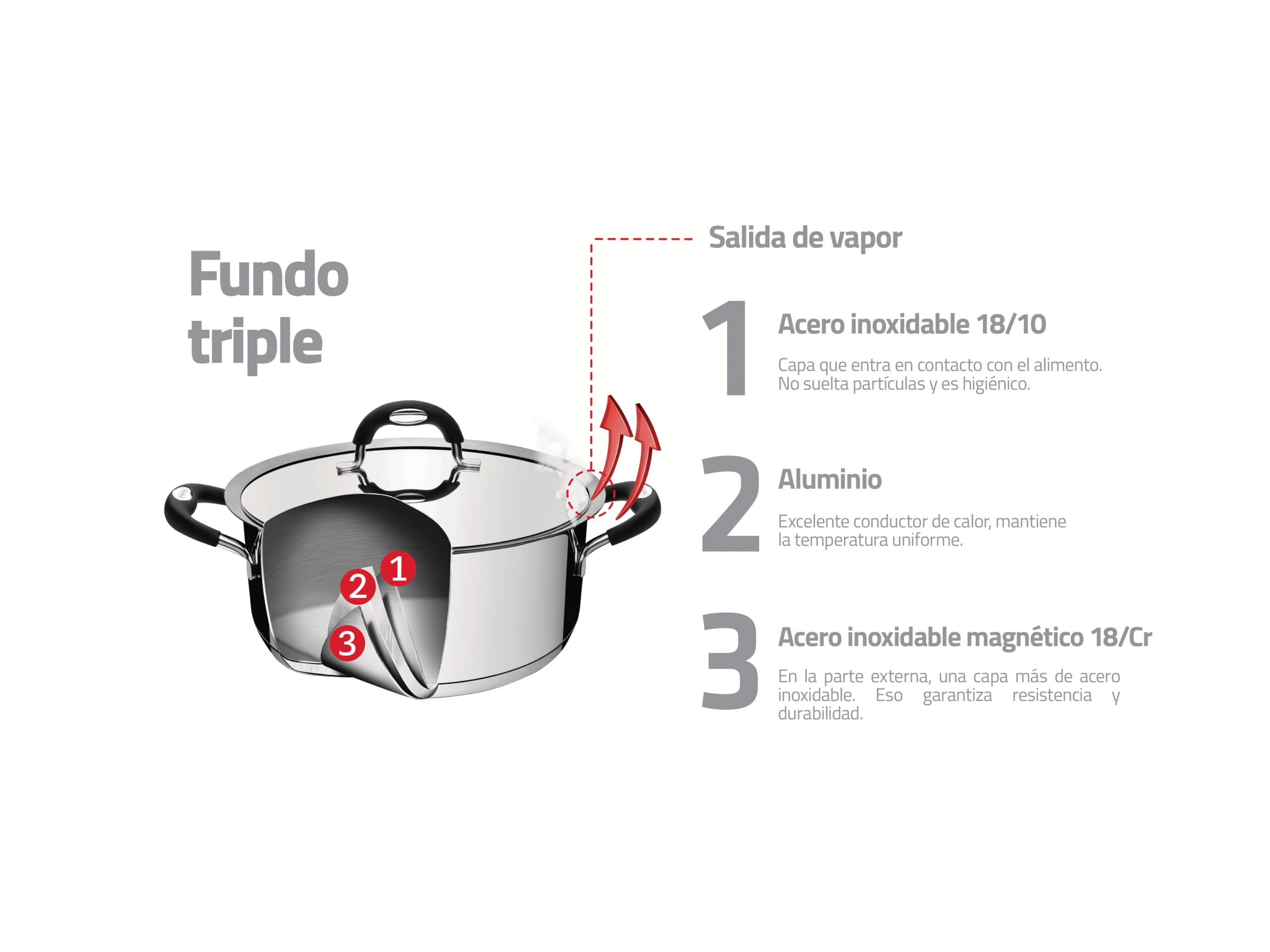 El sartén Tramontina de acero inoxidable fondo triple con tapa y mango de silicona, de 24 cm de diámetro y 3,3 L cuenta con la comodidad y la seguridad de la línea Duo Silicone. Proporcionando un sartén con mango de silicona antitérmica, que trae suavidad en la manipulación y evita quemaduras. Hecho de acero inoxidable con fondo triple (acero inoxidable + aluminio + acero inoxidable), que distribuye el calor uniformemente y proporciona una cocción rápida y uniforme. Además, cuenta con una tapa con escape en la lateral para la salida del vapor, evitando así el efecto de vacío, y tiene encaje perfecto. Haga sus recetas y su cocina brillará con el sartén acero inoxidable de Tramontina.