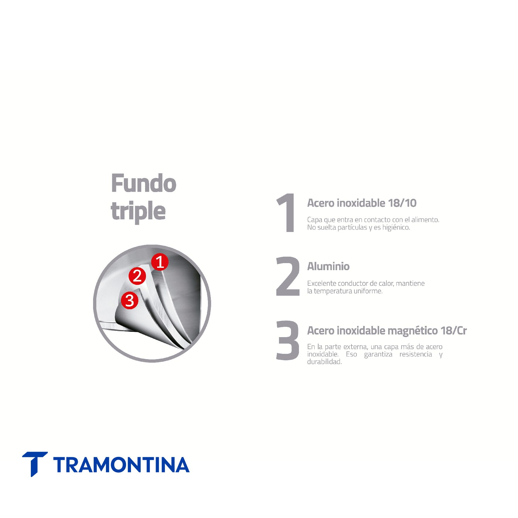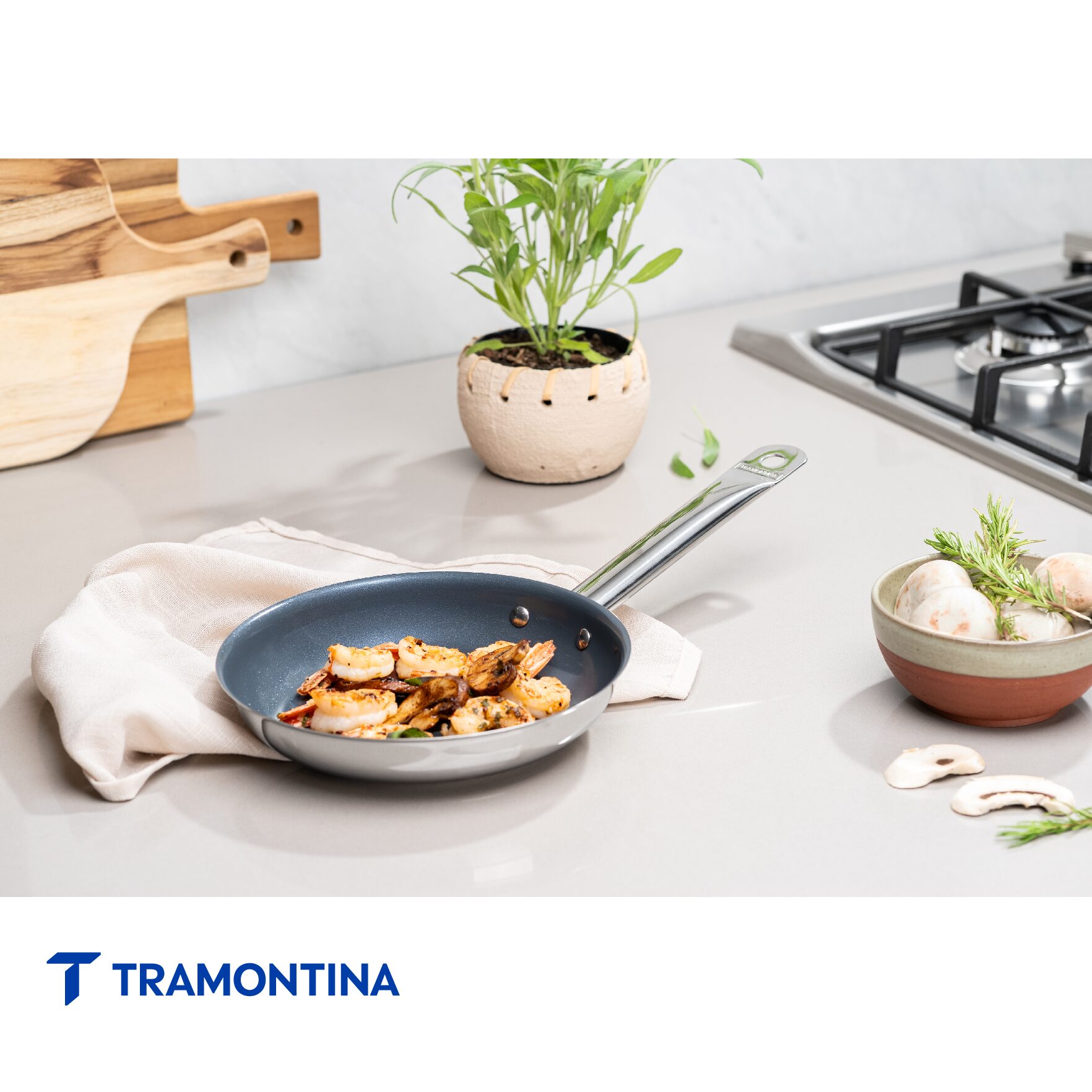 El sartén raso Professional de acero inoxidable con fondo triple y revestimiento interno cerámico grafito de 20 cm y 1,1 l Tramontina, es el compañero perfecto para cocineros profesionales y aficionados. El sartén eleva el nivel de sus recetas por tener un revestimiento cerámico moderno que permite una cocción más sana usando poca grasa. También cuenta con la tecnología de fondo triple (acero inoxidable + aluminio + acero inoxidable) que calienta y mantiene la temperatura de los alimentos durante más tiempo. Es una pieza profesional que demuestra su calidad excepcional con mucho estilo. Son 20 cm de diámetro en un sartén raso con capacidad para 1,3 litros.