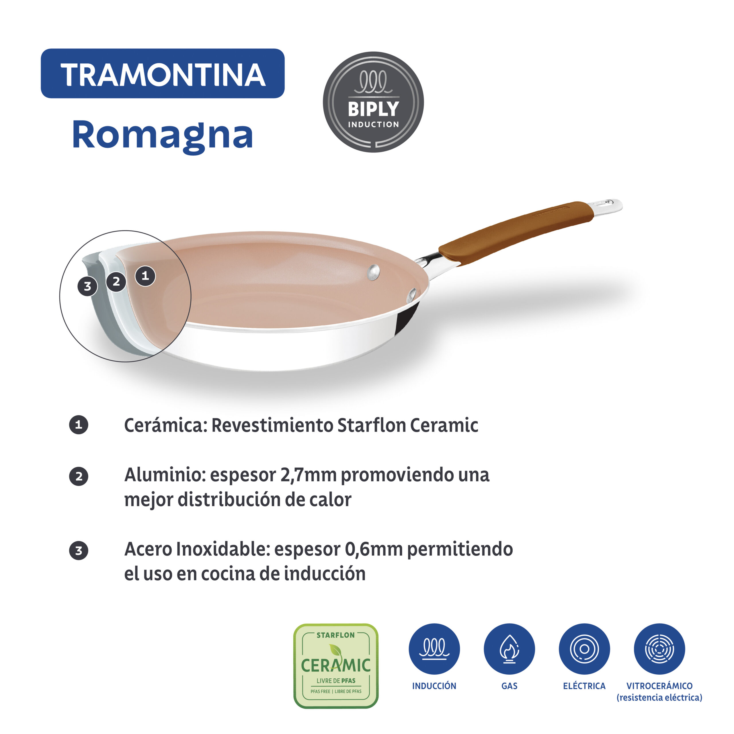 La sartén Tramontina Romagna en acero inoxidable y aluminio con revestimiento interno cerámico marfil de 20 centímetros de diámetro y 1 litro de capacidad es la elección ideal para quienes buscan elegancia y practicidad en la cocina. Con la tecnología Biply Induction, que combina acero inoxidable y aluminio, esta sartén ofrece una cocción rápida y uniforme, además de ahorrar energía y seguridad a la hora de cocinar. Compatible con todo tipo de cocinas, incluso las de inducción, esta sartén es versátil y práctica para su rutina diaria. El mango metálico con protección de silicona ofrece más confort durante el uso. ¡Prepare deliciosas recetas fácilmente y descubra el placer de cocinar con la Sartén Tramontina Romagna!