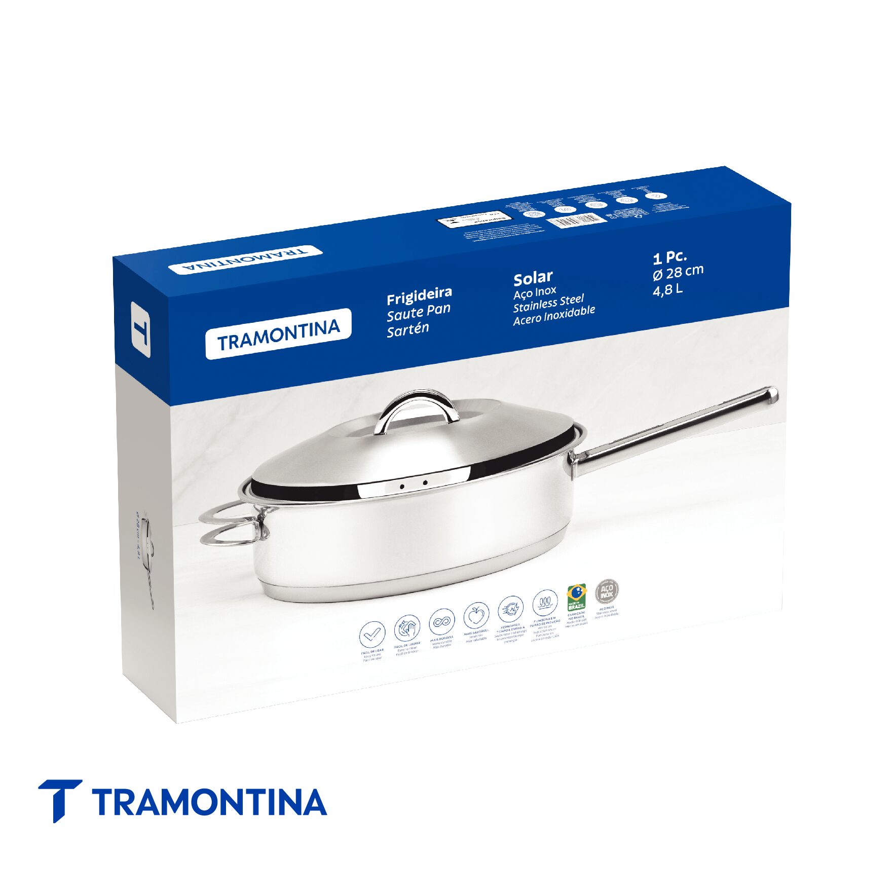 El sartén Tramontina de acero inoxidable fondo triple con tapa, mango y asa 28 cm de diámetro 4,8 L es ideal para quien ya es amante de la gastronomía hace mucho tiempo o para quien recién está comenzando a aventurarse. El sartén forma parte de la línea Solar de Tramontina, y puede ser utilizado tanto en la cocina como en el horno (para temperatura de hasta 260° C). Es la elección correcta para fritar, asar y gratinar. Su fondo triple (acero inoxidable + aluminio + acero inoxidable) garantiza que los alimentos sean cocinados de forma uniforme y sin alteración de sabor, porque el acero inoxidable no suelta partículas que puedan afectar los ingredientes. Perfecta para brillar en su cocina y hacer que sus recetas sean siempre espectaculares.