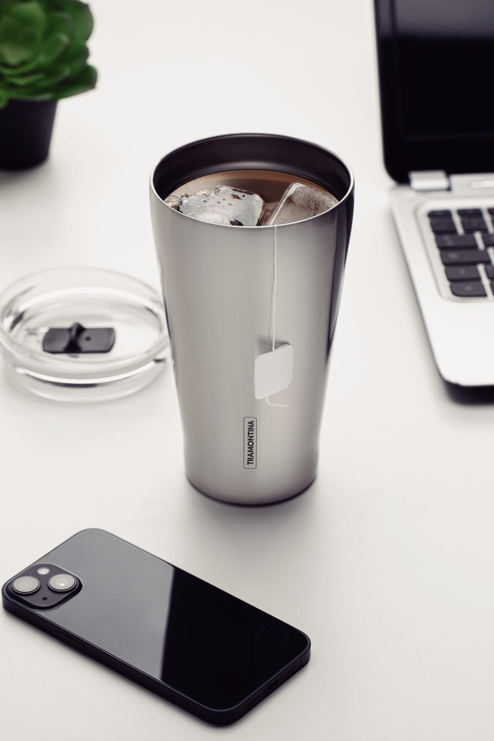Con el vaso térmico Tramontina Exata en acero inoxidable con doble pared con tapa de 550 mililitros garantiza toda la practicidad que necesita para un día a día apretado y lleno de compromisos. Desarrollado en acero inoxidable, cuenta con doble pared y aislamiento al vacío, dos características que mantienen su café, té o bebida a la temperatura ideal por más tiempo. El vaso no contiene BPA, es fácil de lavar, no mancha y no retiene los olores, lo cual permite utilizarlo con diferentes tipos de bebidas. Incluye tapa, posee una abertura para beber sin tener que abrir el vaso y tiene un acabado de silicona que facilita el sellado. ¡La elección ideal para consumir su bebida favorita de manera más práctica y en movimiento, ya sea caminando o en la consola del auto!