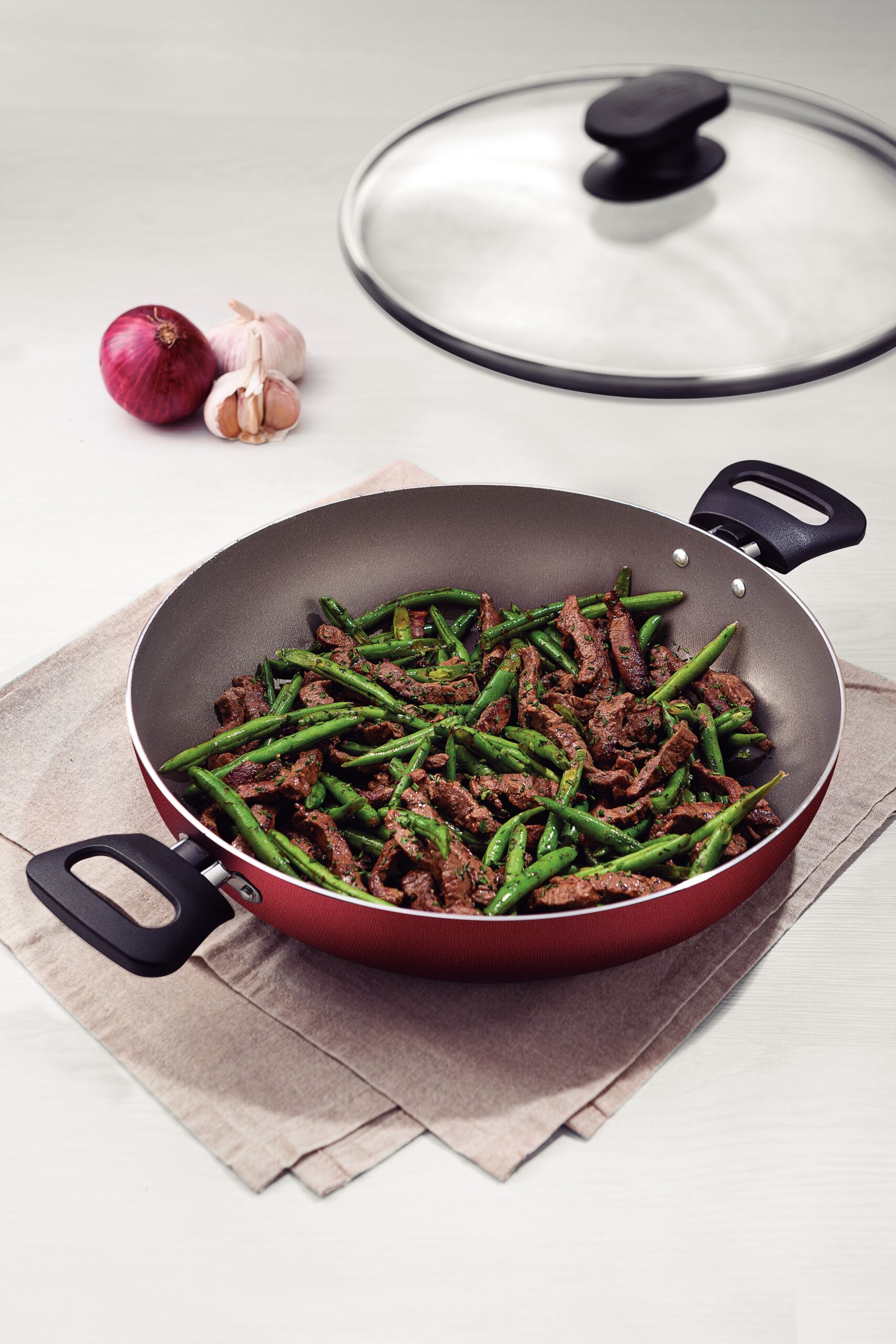 Preparar sus recetas favoritas ahora es mucho más práctico con el wok Tramontina Loreto en aluminio con revestimiento interno antiadherente Starflon Max con tapa de vidrio roja 28 centímetros de diámetro 3,3 litros. Producido en aluminio con 1,8 milímetros de espesor, cuenta con revestimiento interno y externo de antiadherente Starflon Max, un material que evita que los alimentos se peguen en la superficie y facilita aún más la limpieza. Posee asas de baquelita antitérmica y agarrador de nylon, que proporcionan un manejo confortable y seguro, porque no calienta. La tapa está producida en vidrio templado con salida de vapor y borde de acero inoxidable. El Wok Tramontina garantiza rapidez en la preparación, gracias a su formato y a su revestimiento que permite una cocción mucho más saludable, porque exige poca o ninguna utilización de grasa, preservando aún más las propiedades nutritivas de los alimentos, resaltando el sabor de sus platos. ¡Elija Tramontina y descubra resultados increíbles!